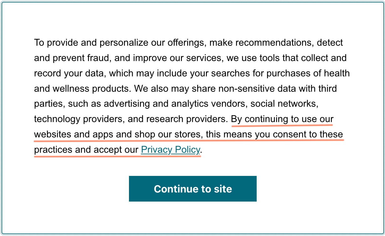 - Explicitly state in the first layer of the consent notice that navigation to the site means that the end-user accepts your organization's conditions