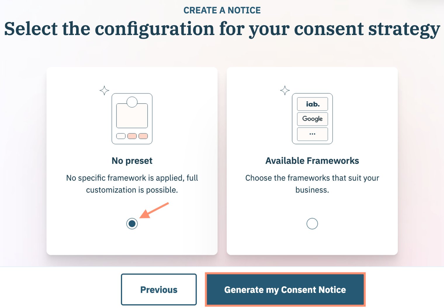 Use the following steps to select if your organization is leveraging any existing frameworks (e.g. Global Privacy Protocol (GPP)) for the consent notice. Click Generate my Consent Notice when finished.