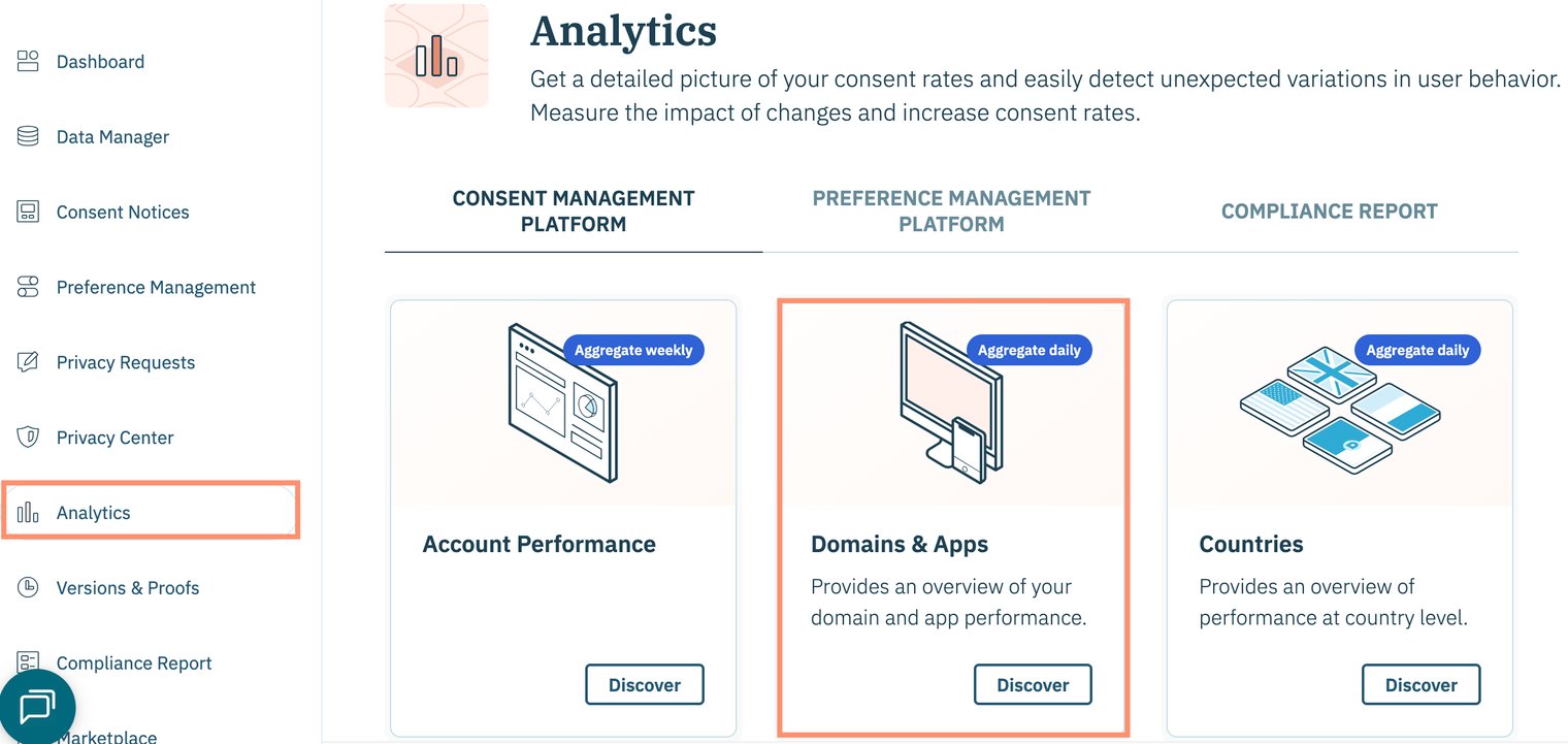 | Share of Consents (Top 10 domains) | View your organization's top 10 performing domains and apps and how their respective volume of opt-in choices contribute to your total opt-in choices (by percentage and volume) |