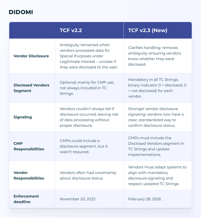 Side-by-side comparison of TCF v2.2 vs v2.3