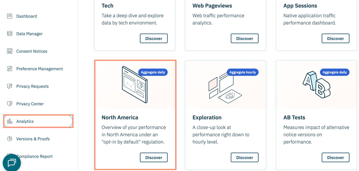 To start, click Analytics on the left-hand panel and select the North America card on the subsequent page.
