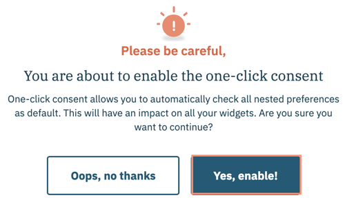 Confirm your decision to enable one-click consent for the purpose in the subsequent modal and click Yes, enable!