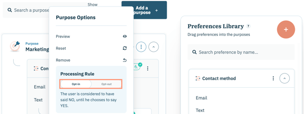 Note: Processing rules for a purpose cannot be adjusted for each preferences widget on which it is included. If processing rules need to vary by preferences widget we recommend creating separate purposes to account for the difference in processing rules.