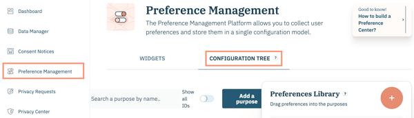 In order to configure a processing rule for apurpose in your configuration tree, click Preference Management on the left-hand panel and select the Configuration Tree tab on the subsequent page.